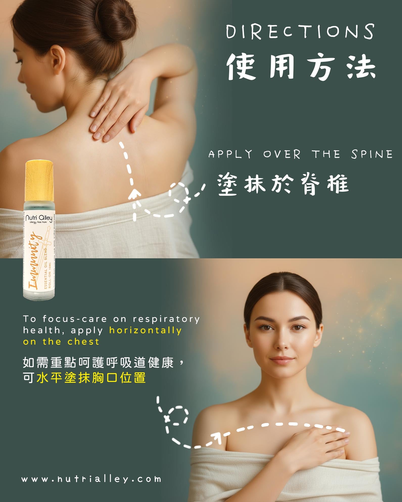每日塗抹IMMUNITY 於背部脊椎位置享最佳效果。