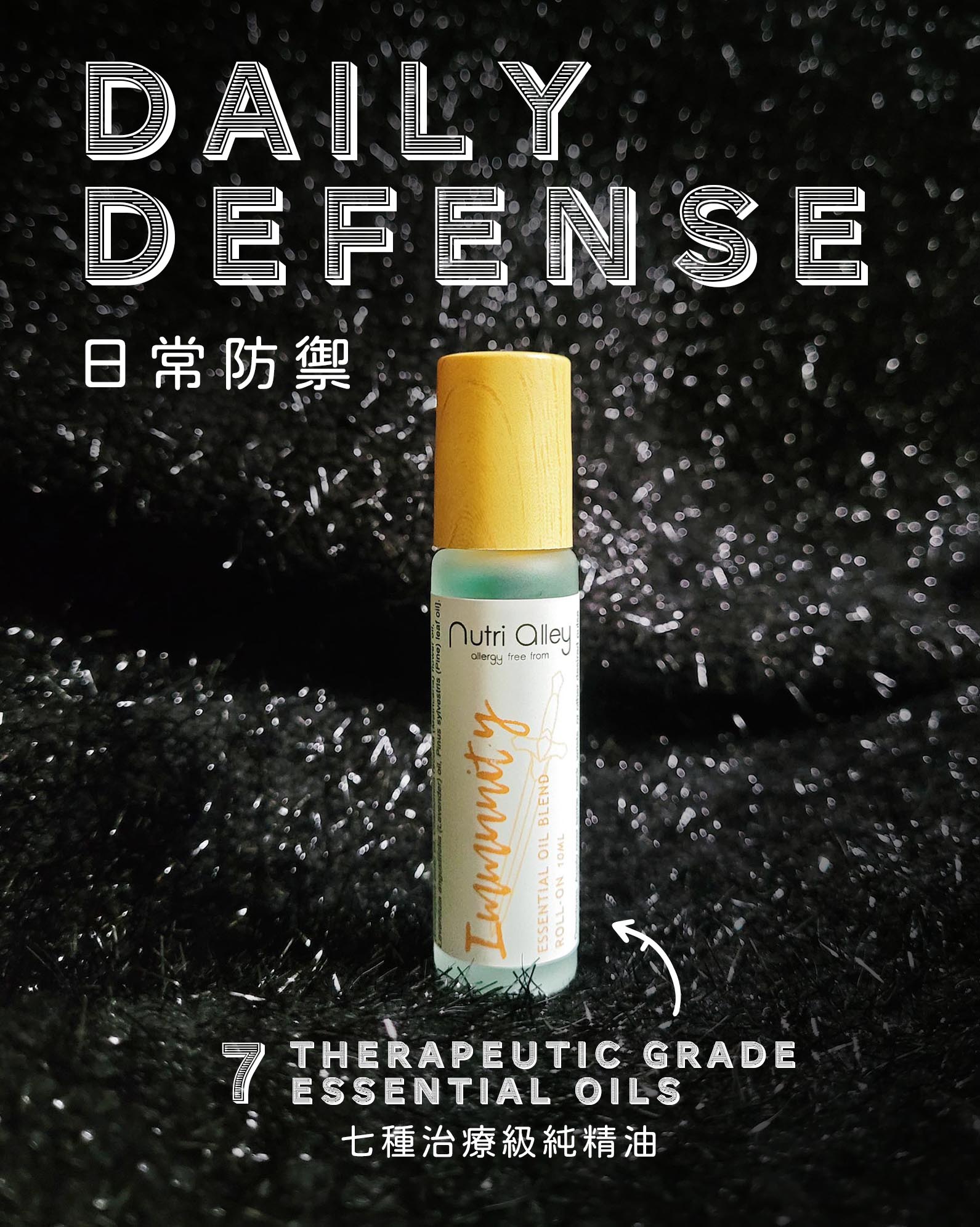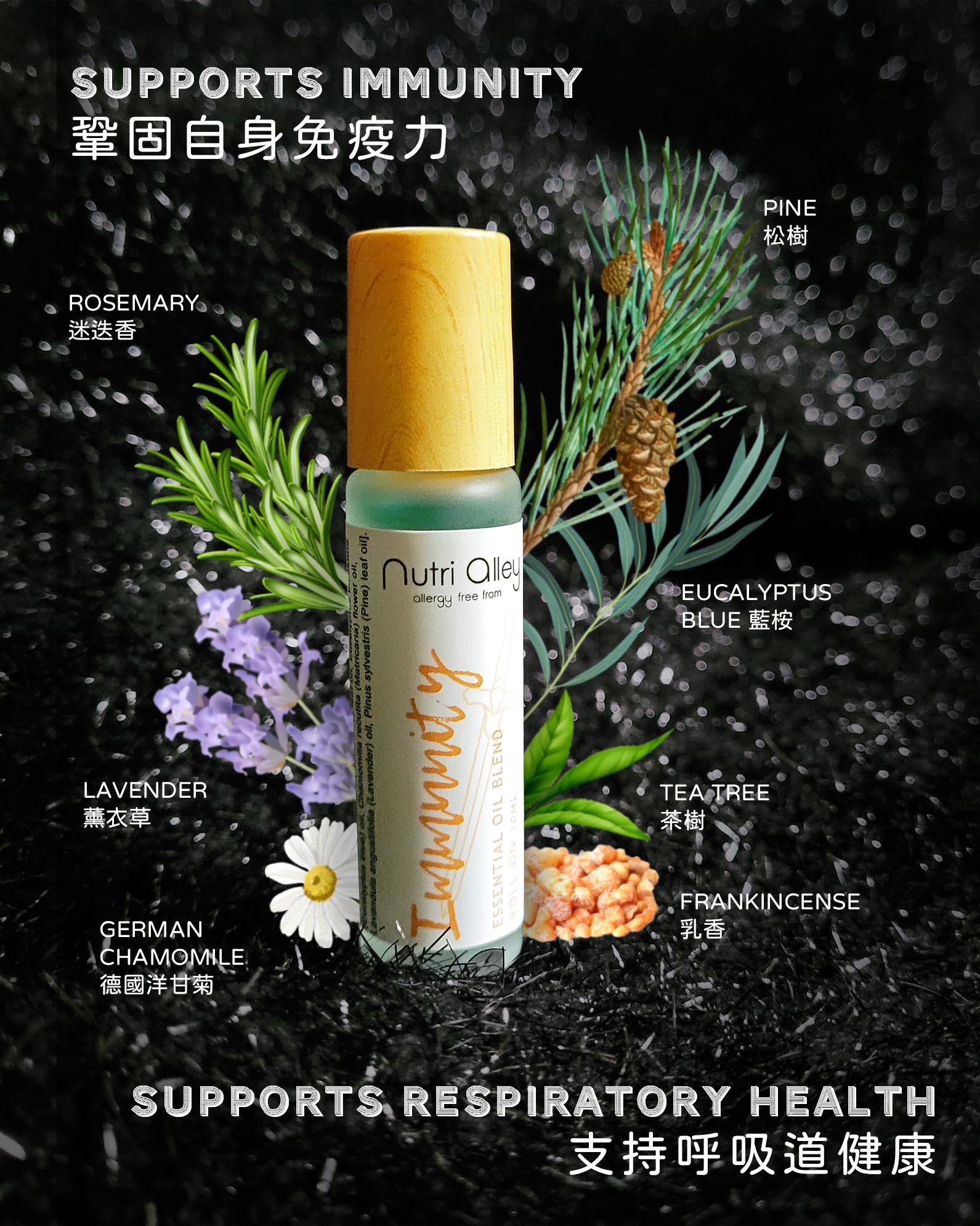 IMMUNITY 結合 7種強效治療級純精油助支持身體維持強免疫力:松樹精油,乳香精油,茶樹精油,迷迭香精油,藍桉精油,德國洋甘菊精油,及薰衣草精油。